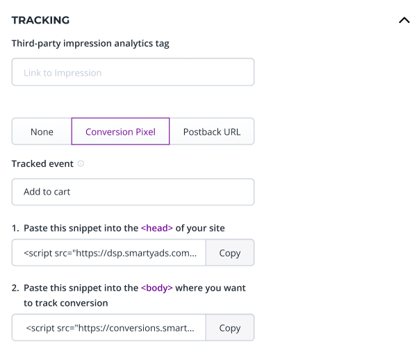 Tracking conversions is essential for evaluating the success of your ad campaigns. In our DSP platform, you can track user actions—such as purchases, sign-ups, or any other valuable interactions on your website—using one of two supported methods: