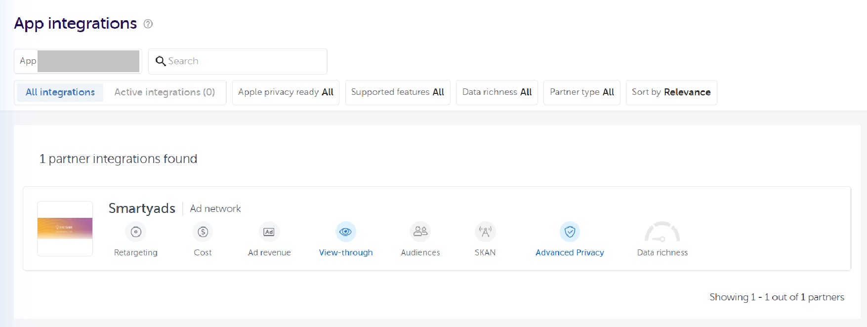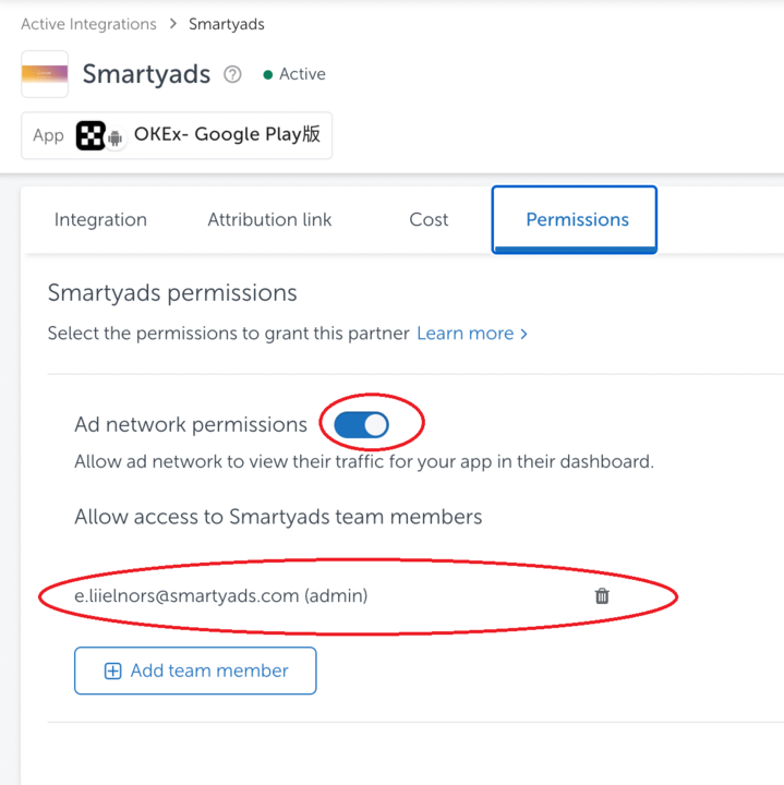 Enable the SmartyAds partner in AppsFlyer using the process described in their Partner activation/deactivation guide. For the integration to function correctly, open: Active Integrations → Smartyads → Permissions and enable the Ad network permissions toggle.