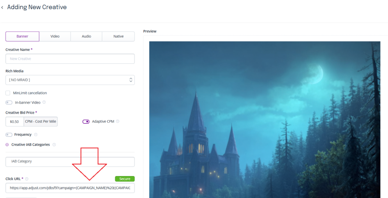 A Click URL (tracking link) is added to the creative.